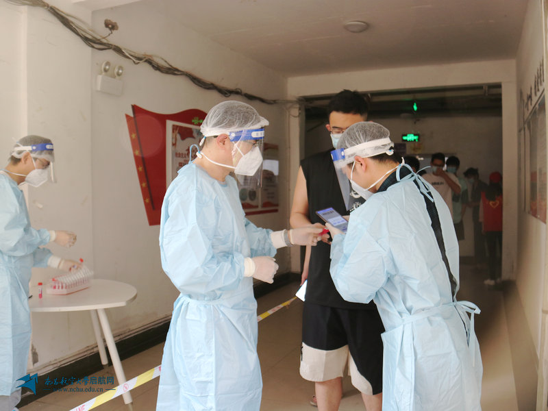 一大早,校领导们便赶赴检测点进行集中培训,学习核酸检测扫码系统的操作方法,确保参与“上岗”后各环节能够快速启动、顺利对接。检测现场,校领导们化身“大蓝”,罗旭彪在15栋和16栋负责扫码工作,耐心引导同学们提前打开昌通码,并录入采样个人信息;何兴道、陈震、汤华中分别在17栋和18栋、23栋和24栋、11栋和12栋担任身份核验助理,全身心投入志愿服务工作,协助医护人员圆满完成检测任务。