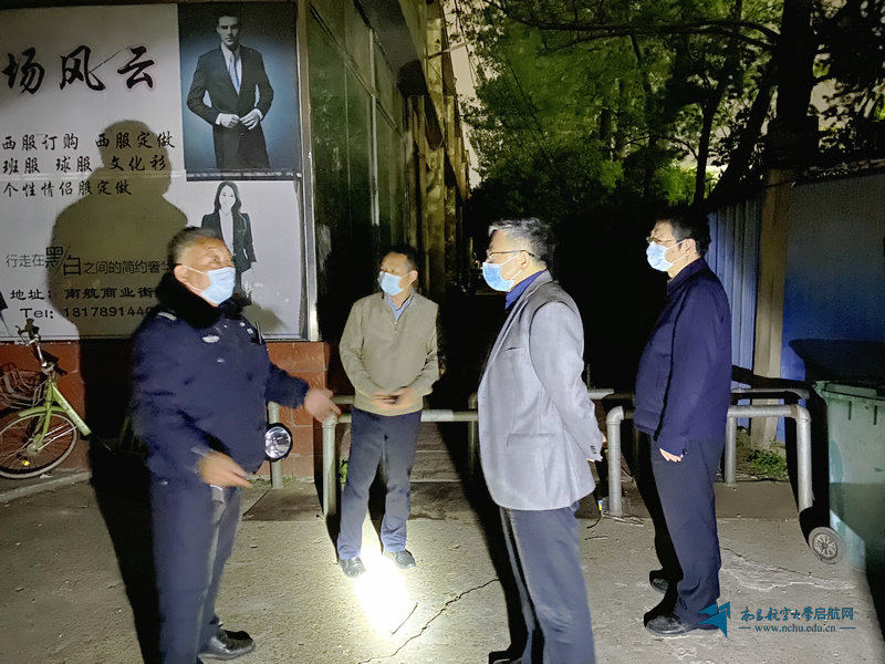 启航网讯 4月15日凌晨1:30,学校党委书记罗嗣海、副校长郭正华深入校园防控一线视察指导校门、围墙防控工作。
