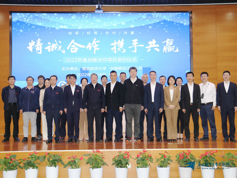 启航网讯 为抢抓数字经济发展机遇,共谋智能技术未来广阔前景,5月16日上午,我校与中国移动通信集团江西有限公司(简称“中国移动江西公司”)举行战略合作协议签约仪式。我校党委书记罗嗣海与中国移动江西公司党委书记、董事长、总经理凌浩出席仪式并讲话。我校党委副书记罗旭彪、副校长何兴道,中国移动江西公司董事、副总经理程江,董事、副总经理黄圣明,南昌分公司党委书记、总经理贺玲和相关部门负责人,以及我校党办校办、教务处、科技处、国内合作与联络处、环境与化学工程学院、航空制造工程学院、信息工程学院、现代教育技术与信息中心相关负责人参加。签约仪式由罗旭彪主持。