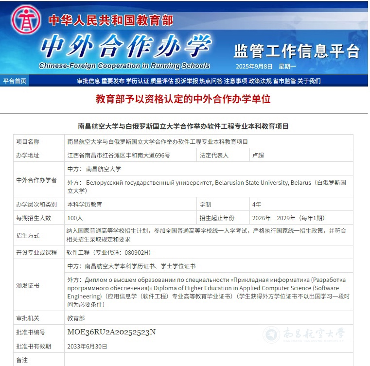 本项目招生纳入国家普通高等教育招生计划,实行“4+0”办学模式(即在南昌航空大学学习4年,可获双方毕业文凭),由双方学校共同制定培养方案,引入白俄罗斯国立大学优质教育教学资源开展学生联合培养。完成学业且成绩达到专业培养要求的项目学生,可获得南昌航空大学本科毕业证书、学士学位证,以及白俄罗斯国立大学本科文凭,学生也可根据自愿的原则选择赴白俄罗斯国立大学继续深造。