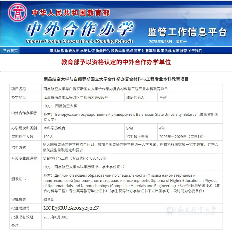 启航网讯 近日,教育部公布了中外合作办学项目的最新评审结果,我校与白俄罗斯国立大学拟合作举办的两个本科教育项目获批,分别为复合材料与工程和软件工程专业。该项目拟于明年9月实现招生,至此,我校获教育部批准在办中外合作办学项目数达4个,居省内高校前列。