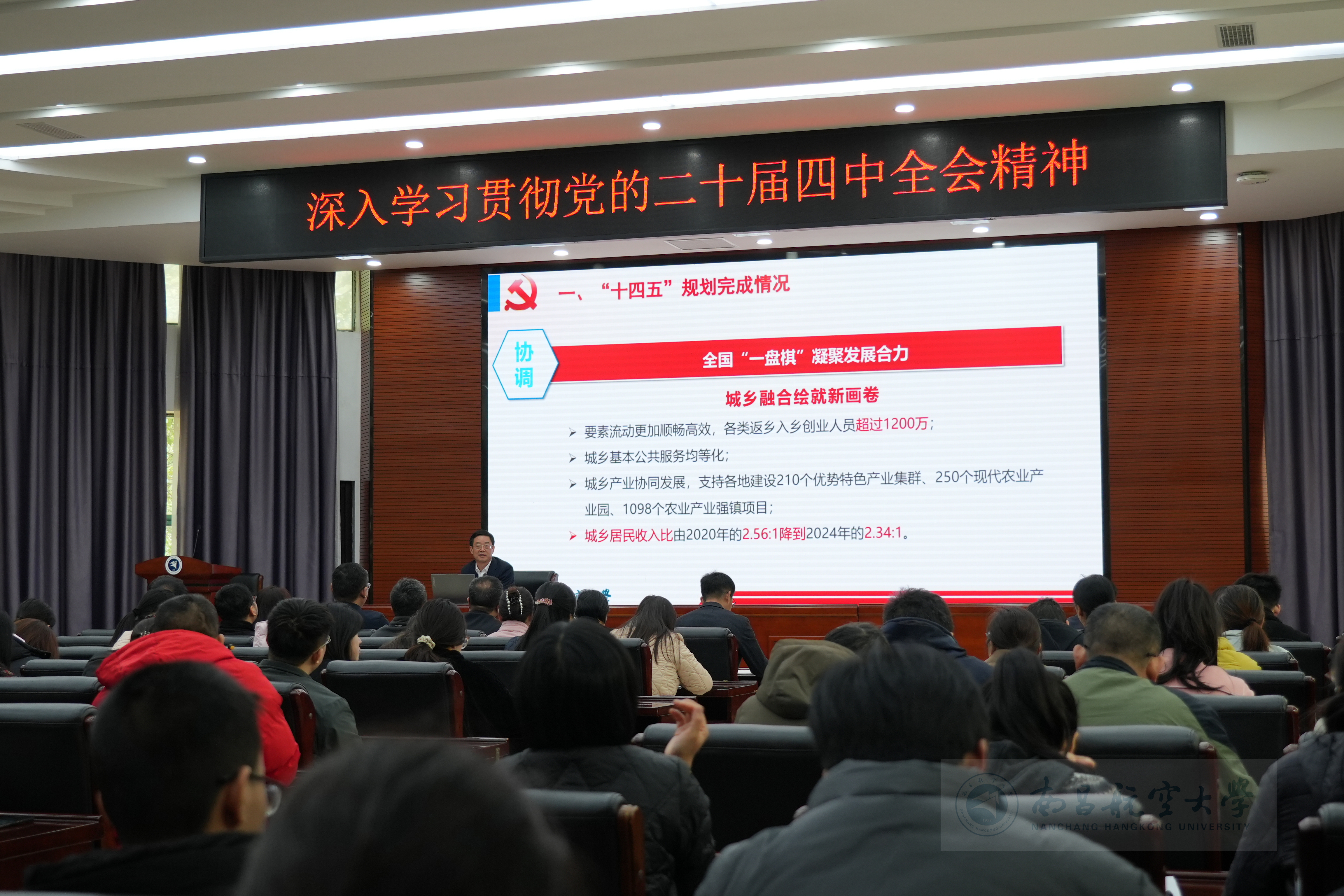 12月5日,党委书记李德平以“奋力开创中国式现代化建设新局面——深入学习贯彻党的二十届四中全会精神” 为题,为外国语学院、经济管理学院师生宣讲党的二十届四中全会精神。李德平从“十四五”规划完成情况、国内外形势和中国式现代化任务、“十五五”规划主要内容等方面,对党的二十届四中全会精神作了系统阐释和全面宣讲,并分析了《习近平谈治国理政》第一卷至第五卷的逻辑结构与理论特色,阐述了学校事业发展“十五五”规划展望。李德平强调,全校师生要以全会精神为指引,接续奋斗,奋力实现“十四五”规划圆满收官、“十五五”良好开局。