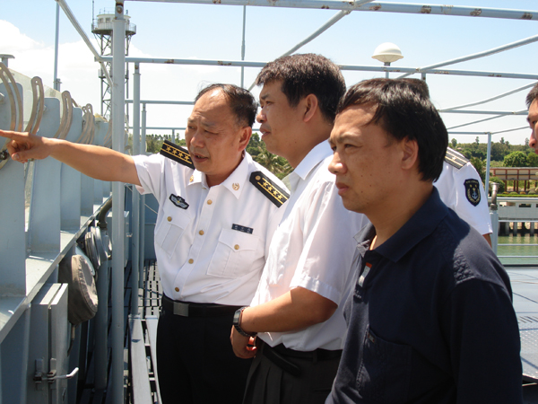 在为期4天的访问中,余校长、黄副书记一行还先后走访了海军南海舰队长沙舰、登6支队、992舰、海军陆战队、北海卫戍部队等部队,听取了有关负责同志对舰船装备、战略意图、舰队历史的介绍,参观了我校海军国防生进行海训的生活、训练场所,并对他们海训的一些基本情况进行了仔细询问,同时也对各个基层部队一直以来给予我校国防生海训工作的大力支持表示感谢。
