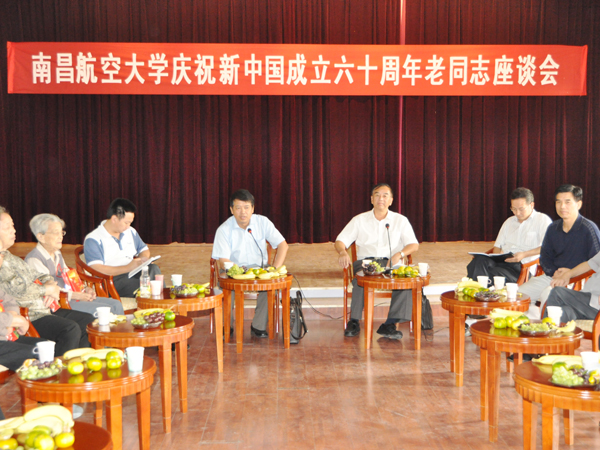 启航网讯 9月28日上午,上海路校区老干部活动中心里洋溢着欢乐和谐的气氛,南昌航空大学庆祝新中国成立60周年老同志座谈会在这里召开。这是我校“在建国六十周年之际开展走访慰问活动”的系列活动之一。校长余欢、副校长夏立先与我校离休干部和建老人员代表欢聚一堂,共话发展,喜迎国庆。校党委组织部、宣传部、党政办、离退休处相关负责同志和工作人员会谈时在座。座谈会由夏立先副校长主持。