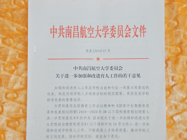十一五期间,学校先后制定了《南昌航空工业学院关于进一步加强和改进大学生思想政治教育的实施意见》、《中共南昌航空大学委员会关于进一步加强和改进育人工作的若干意见》和一系列可操作的配套文件及措施。明确了学校加强和改进大学生思想政治教育的总体思路,强化和完善了学生思想政治教育的组织领导和体制保障。从基本理念、管理体制、运行机制、育人环境等方面积极探索建立大学生思想政治教育的长效机制,并迅速赋予实践。大学生思想道德素质、专业素质、身心健康素质等得到全面提高。