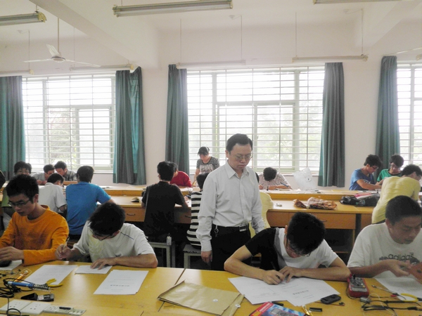 刘副校长一行巡视了大一组、大二组、大三组的十个考场。每到一处,他都与参赛选手亲切交谈,详细询问他们的制作情况,鼓励同学们积极参加科技创新活动,增强动手能力。