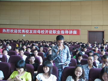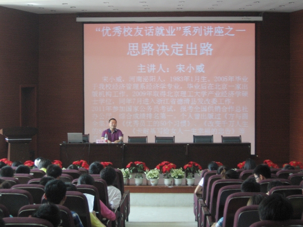 5月19日,“优秀校友话就业”活动在逸夫楼学术报告厅拉开了序幕。我校2005届优秀校友宋小威应邀做了“思路决定出路”的精彩报告,受到了我校学生的热烈欢迎。