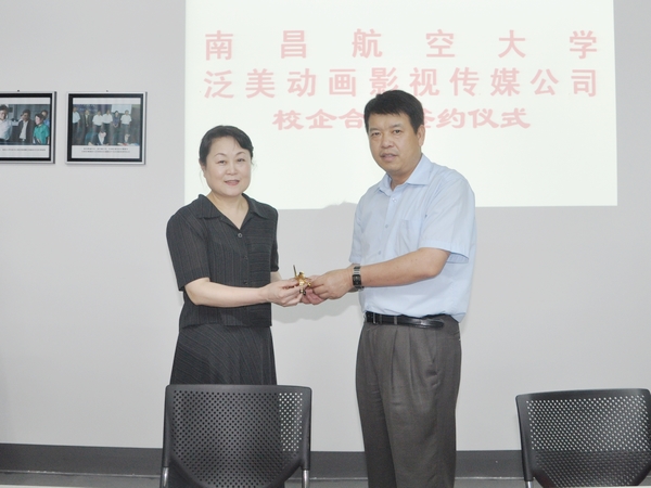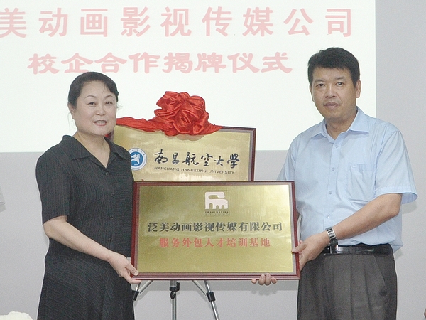 仪式上,校企双方分别签署了“校企合作框架协议书”和“实训协议书”,余欢校长与企业方领导范冰冰为设在江西泛美动画影视传媒有限公司的“南昌航空大学实习实训基地”揭牌,信息工程学院副院长马银平代表学院接受了设在我校的“泛美动画影视传媒有限公司服务外包人才培训基地”牌匾。校企双方领导在仪式上交换了纪念品。