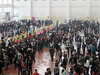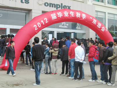 在学校各部门的通力合作下,2012届毕业生秋季“双选会”于19日上午9点开始。招聘现场广大毕业生积极应聘,依次等候;海军学院国防生正装威严,认真履行着会场的安全保卫职责;职业规划与就业指导协会会员专业细致,为用人单位提供各项会场服务,协助他们的招聘工作。整个会场气氛热烈,秩序井然。