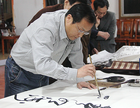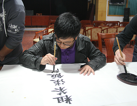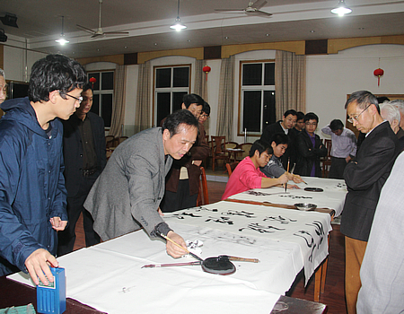 启航网讯 4月20日晚,为了弘扬中国传统文化,抒发时代豪情,由学校书法协会主办,离退休处协办的书法笔会在上海路校区活动中心举行,老领导孙一先、骆欣荣、党委宣传部部长饶国宾等50多位书法爱好者欣然赴会。活动由校书法协会会长江山主持。