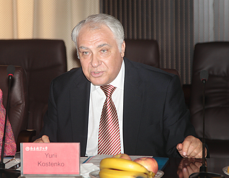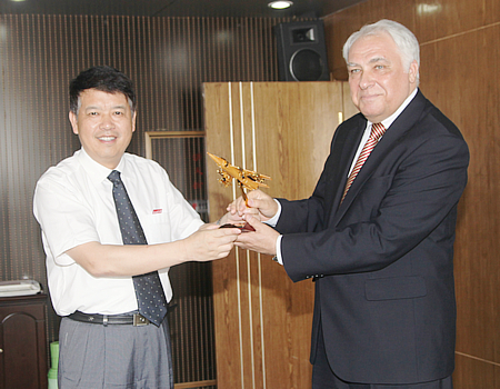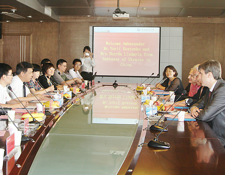 余欢首先对贵宾一行表示了热烈欢迎,向客人系统介绍了昌航的发展变革史、学科建设、人才培养、科学研究、校企产学研战略合作等方面的情况,着重介绍了学校近几年来在人才培养、科学研究、高等教育国际化等各项工作所取得的成绩,并就我校在飞行器设计、机械制造及检测与控制等特色专业方面的优秀科研成果和技术做了细致讲述。余欢校长还如数家珍地向客人介绍了我校产学研精品,如“都市精灵”无人直升机、“中华号”无人机、“红嘴鸥”轻型运动飞机及搅拌摩擦焊技术、远距离穿针技术与装备等。随后,余欢校长重点就我校国际合作与交流状况,尤其是与乌克兰国立航空大学、敖德萨国立技术大学和第聂伯彼得罗夫斯克大学合作、领导互访的历史和现状及我校聘有的留乌学子在校任教等情况向大使先生做了详细介绍。余欢校长精心安排了我校飞行器工程学院丁相玉、信息工程学院杨谊华、分析测试中心叶寅等分别毕业于以上三所乌克兰高校的三位教师与大使先生及其夫人畅谈了他们的留学经历,引起大使先生及夫人的强烈共鸣,将会谈推向了高潮。余欢最后提出,希望能够通过大使先生来访之机推动我校与现有乌方合作院校的切实合作,并进一步拓展与其他乌克兰知名高校的合作关系。