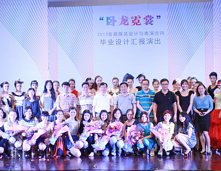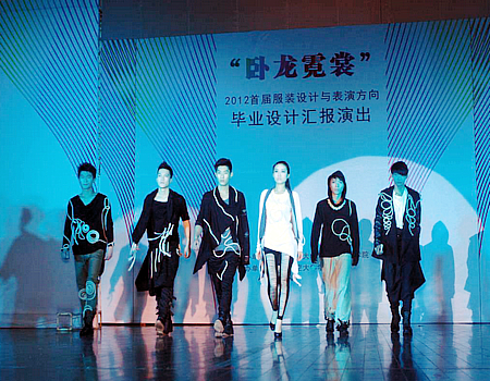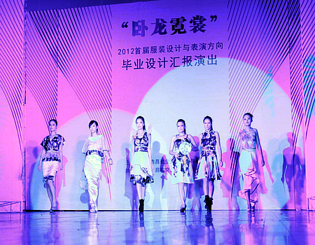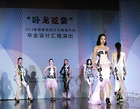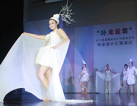 这场名为“卧龙霓裳”的汇演展示了在杜娟、罗娟等老师精心指导下由2008级学院首届16名服装设计与表演方向的学生设计并亲手制作的16个系列96套作品。整场表演融服装设计、造型、化妆、音乐、灯光和舞台美术设计于一体,16位学生既是设计师又是表演者,激情诠释着对服装设计的感悟和理解,展演效果美仑美奂,充分体现了90后时装设计师们个性化的创意思维和敢为人先的时尚理念。其中翟巾萱同学的作品《内秀》,在粉缎上用黑色PU模拟了人体骨骼的形态,并用亮钻装饰,作品璀璨耀眼。邹青男同学的作品《旧时光》,利用皮革切割、镂空、和铆钉等技术使厚重的皮革呈现出轻巧的感觉,突出朋克文化下女性的柔美。庄冰斌同学的作品《化蝶》,将普通的白绵绳通过打结、缠绕,做制作成美丽的衣服和帽子,巧妙反映了蝴蝶由蛹蜕变成美丽蝴蝶的过程,寓意由一名学生转变成设计师的艰辛过程。