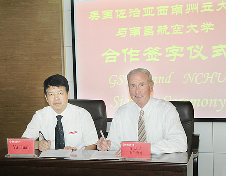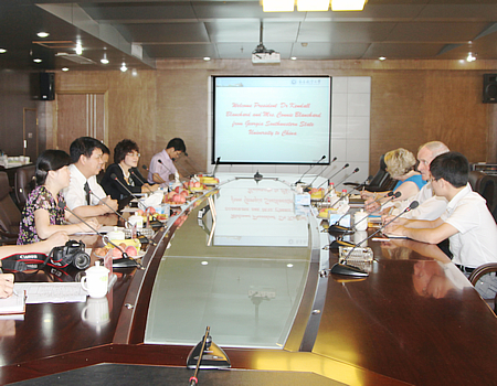 我校与佐治亚西南州立大学同为教育部中国教育国际交流协会《1 2 1中美人才培养计划》的成员单位。2010年底,余欢校长一行3人参加教育部《1 2 1中美人才培养计划高校管理人员能力建设培训团》,并作为团长带领该团21人赴美参加培训。期间,培训团拜会了《1 2 1中美人才培养计划》中的美方部分高校。在佐治亚西南州立大学访问时,余欢校长一行受到了Kendall Blanchard校长的热情友好接待。合作洽谈和学习培训之余,佐治亚西南州立大学Kendall Blanchard校长为余欢校长一行安排了丰富的活动,双方建立了深厚的友谊。本次Kendall Blanchard校长夫妇应余欢校长热情邀请前来我校访问,旨在建立两校间的双边合作关系并庆贺我校成立60周年。来访期间,余欢校长和Kendall Blanchard校长分别代表两校签署协议,建立了两校间的正式合作关系,Kendall Blanchard校长夫妇与余欢校长共续了友谊。Kendall Blanchard校长夫妇对于余欢校长优异的工作能力、学术成就和出色的音乐天赋再三表示赞叹,同时对两校间的合作前景充满了信心。