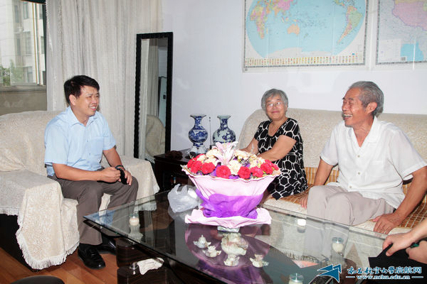 校领导余欢等亲切看望退休教师王薇薇和张绍兴夫妇。(摄影 余尚峰)