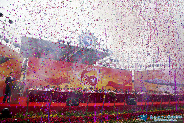 启航网讯 六十载,育精英,呕心沥血,铸就昌航辉煌基业;庆华诞,谋大计,继往开来,谱写母校宏伟蓝图!10月9日上午,阳光明媚,晴空万里,前湖校区内,花团锦簇、彩旗飘扬,处处洋溢着欢乐喜庆的气氛。在宽阔的田径场内,人如潮涌,热情四溢,南昌航空大学校庆六十周年庆典大会在这里隆重举行。教育部、国家国防科工局、中航工业集团公司、中国人民解放军海军和省委、省政府分别发来贺信。各级领导、各界来宾、海内外校友及学校师生代表齐聚一堂,同贺昌航六秩华诞,共商学校发展大计。