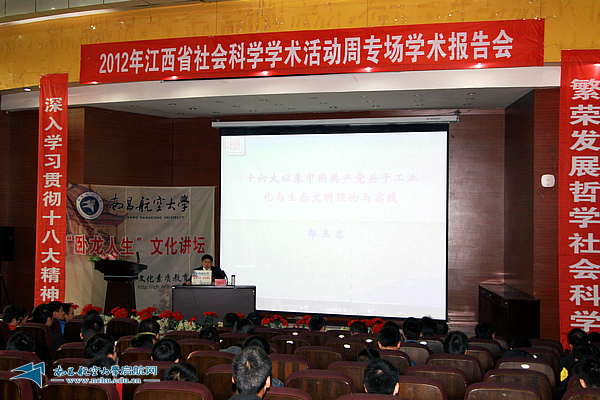启航网讯 12月6日,以“人文兴赣:传承·创新·发展”为主题的江西省社会科学学术活动在南昌航空大学逸夫楼学术报告厅举行,江西科技师范大学校长郭杰忠教授做客“卧龙人生”文化讲坛,为我们解说十六大以来中国共产党工业化与生态文明理论与实践。学校副校长唐星华主持报告会。