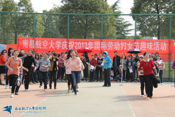 南昌航空大学庆祝2013年“三八”妇女节趣味活动精彩上演。学校纪委书记王玉芝,学校工会主席、副主席等到现场观战并为获奖单位颁奖合影。