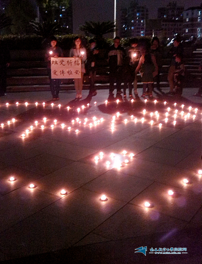 4月22日晚7点,“烛光祈福” 在大学生活动中心举行。天空阴沉沉的,很冷。祈福活动还未开始,现场就已聚集了大量的昌航学子,等待着这肃穆的一刻。活动开始后,志愿者们点燃了事先在广场摆好的蜡烛,蜡烛围成了一颗大大的心,昭示着昌航人那一颗火热跳动着的心,蜡烛的中央还摆着“420”三个数字,以此悼念4月20号这个令人悲痛的日子。同学们围着大大的爱心,闭上双眼默哀着、祈祷着。