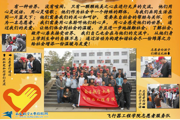 2010年11月,飞行器工程学院在三联特殊教育学校成立了志愿者服务基地,开始爱心之旅,长期定点在那里服务聋哑儿童,给他们带去更多的关怀。时间已过去了三年,飞行器学院志愿者陆续开展了“航空图片展”、“与聋哑儿童一起制作航模小飞机”、“卡片沟通你我心”、“学学手语”、“游戏见友情”等活动,平时,志愿者还经常通过QQ、写信与聋哑孩子们联系。让大家高兴的是,已经长大的聋哑青年们,通过他们自身的努力走入了工作岗位,用自己的劳动回报社会,延续爱心。这一系列的活动,引起了江西省各大媒体关注。通过媒体的力量,号召社会关注聋哑儿童,关爱他们的成长。