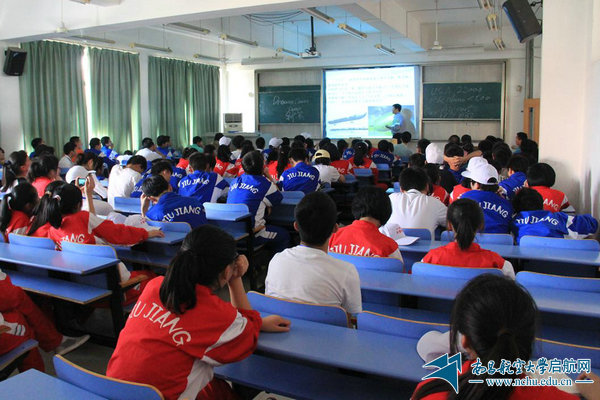 九江外国语学校的老师同学们在认真听取我校特色课程讲座--航空概论。(摄影 魏志鹏)