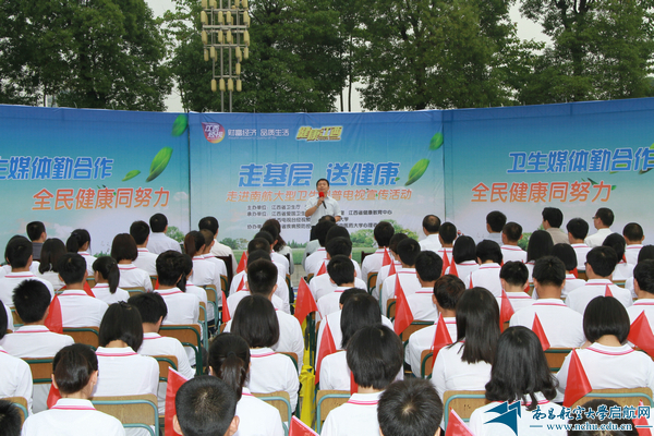 启航网讯 为提高大学生的卫生保健水平和健康素养,省卫生厅、江西电视台、省健康教育中心、《健康江西》栏目组于5月19日上午走进南昌航空大学,开展以“走基层,送健康”为主题的大型卫生科普电视宣传活动。此次活动由江西省卫生厅、江西电视台主办,江西省爱国卫生委员会办公室、江西省健康教育中心、江西电视台经视频道、南昌航空大学承办。省卫生厅副厅长邹国荣、我校副校长唐星华、省健康教育中心、省中医药大学、省疾控中心等单位相关人员以及我校部分学生参加了本次活动。