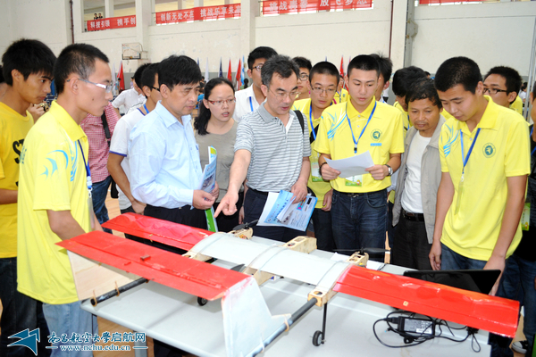 决赛评审专家认真评议我校特等奖作品“垂直起降固定翼飞行器”。 (摄影 校团委)