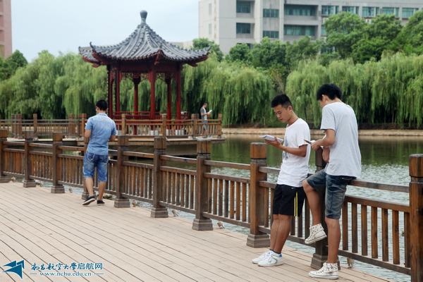 “暑假期间这里很凉快,我们每天大约7:00左右过来读书,8:30离开。”100321班的鞠祖强说,“这里有水,有树,有凉风,有亭台楼阁,在这充满诗情画意的校园里读书,神清气爽。”