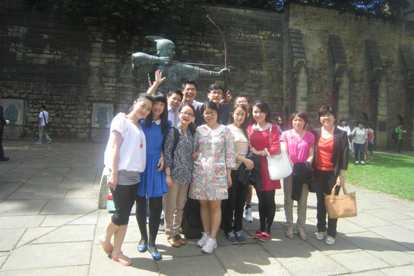 全体学员在诺丁汉中心学院罗宾汉雕塑前合影。
