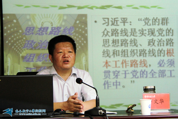 省委党校党史党建教研部副主任卢文华教授应邀作了“党的群众路线”专题学习辅导报告。他从党的群众路线基本理论多维度解读,坚持和贯彻群众路线的实践要求,有效开展教育实践活动的途径和办法等三面方面作了深刻论述。对于党的群众路线基本理论,他从群众路线是党的生命线、群众路线是党的根本工作路线、群众路线在《党章》中的表述、群众路线教育实践活动的主要内容是“为民务实清廉、群众路线教育实践活动的根本是密切党群干群关系等方面进行了详细的解读。就有效开展教育实践活动的途径和办法他提出了四个有效的方法:突出作风建设,用好的作风开展好的教育实践活动;把“照镜子、正衣冠、洗洗澡、治治病”的总要求贯穿始终;以整风精神开展批评与自我批评,开好民主生活会,坚持开门搞活动;以这次活动为契机,制定新的制度、完善已有的制度,废止不适用的制度。卢教授的报告内容丰富、信息量大、深入浅出,具有较强的针对性和指导性,受到大家的一致好评。