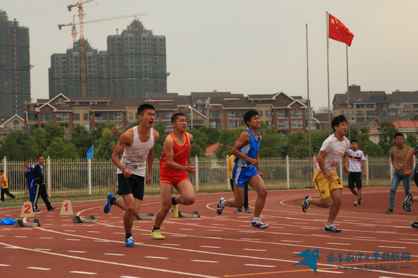 男子100米比赛中同学们如离弦之箭、奋勇向前。