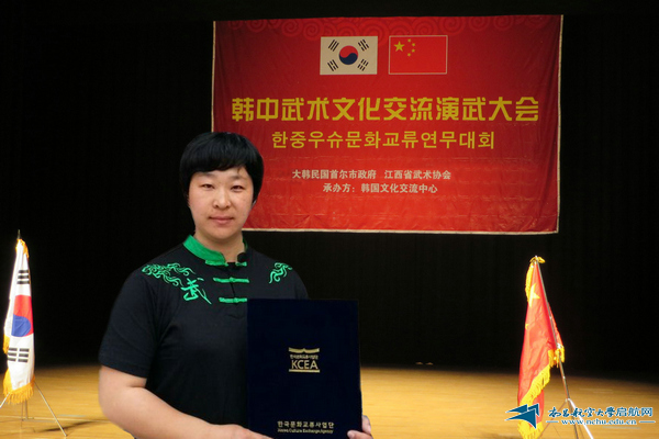 启航网讯 由大韩民国首尔市政府、江西武术协会主办,韩国文化交流中心承办的中韩武术文化交流大会4月9日—4月12日在韩国首都首尔举行,大会由中韩武术文化交流大会演武大会与武术文化研讨会两部分组成,我校体育学院熊锦平和张莉两位老师获邀作为中方代表团成员参加了上述活动,张莉在演武大会上表演中国传统武术套路并获得武术套路双鞭一等奖,为学校赢得了荣誉。熊锦平作为代表团代表还受到了韩国国会议员的热情接待。