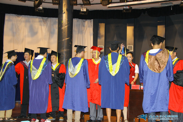 校领导余欢、王玉芝、罗胜联、唐星华、刘卫东为每一位毕业生拨正流苏,颁发毕业证书并一一合影留念。