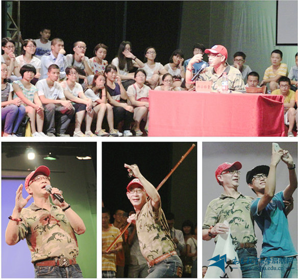 章金莱为我校师生带来的讲座题为“苦练七十二变,笑对八十一难”,讲座接近尾声时,他为大家详解了这两句话的含义,也与大家分享了自己的三个梦想,鼓励大家敢作敢为,勇于追梦,因为有梦才能好梦成真。他还告诫在座的青年学生们,“一无所有的时候要坚持,该有都有的时候要淡定”,并祝福大家都有灿烂前程。随后,还为大家献上了不可多得的精彩表演,现场的掌声赞叹声不绝于耳。
