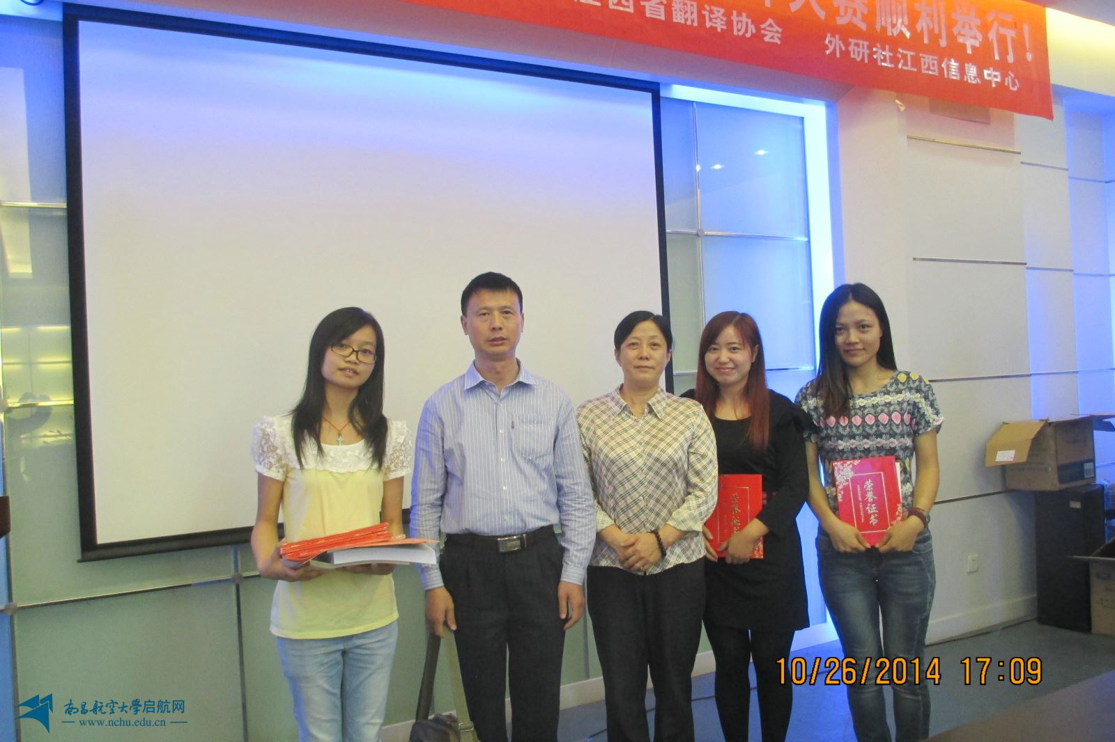 荣获江西省第六届翻译大赛一等奖的昌航学子及其指导老师。