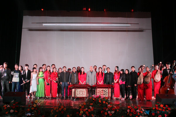 余欢等与大学生艺术团同学在音乐会结束后合影留念。