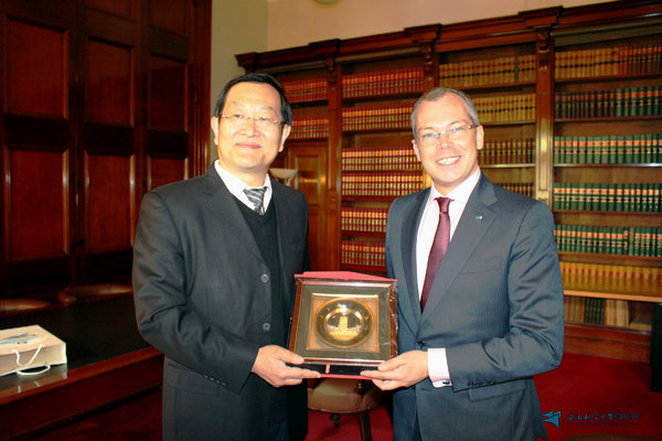 访澳期间,傅克刚一行还应邀访问了我校合作伙伴澳大利亚教育管理集团总部,与该集团总经理李新庆就合作办学、网络教学资源共享等方面取得共识。代表团实地考察了该集团的中国文化展示中心,对该集团在中澳文化交流、汉语推广等方面取得的成绩留下了深刻的印象。11月27日,傅克刚一行应邀访问了墨尔本市政厅,受到了副市长Richard Foster的热情接待。