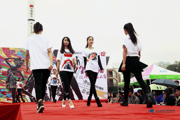 我校学子身着自制的涂鸦文化衫展示对社会主义核心价值观的认知。