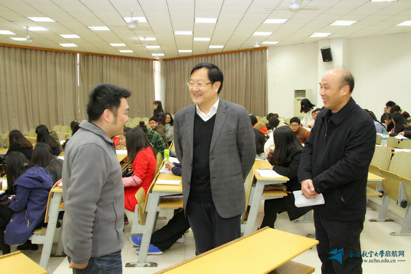 傅克刚认真听取新学期第一课,课间与任课老师亲切交谈,希望老师们能进一步提高授课质量,加强教学的针对性和实效性。(摄影 纪兴)