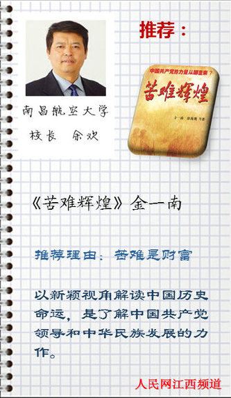 “世界读书日”前夕,人民网江西频道开展了“邀请江西九大高校校长推荐好书”活动。校长余欢应邀推荐《苦难辉煌》:苦难是财富。该书以新颖视角解读中国历史命运,是了解中国共产党领导和中华民族发展的力作。人民网江西频道于“世界读书日”当天通过微博、微信向全社会公开发布了包括我校校长余欢在内的江西九大高校校长的推荐书籍,倡导全民阅读新风尚。