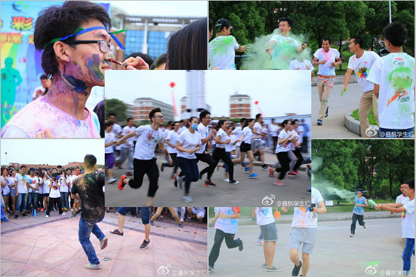 “彩虹跑”来源于印度洒红节,中国版彩虹跑在继承其“传播快乐”精髓的基础上,为其注入了本土特色,焕发出新鲜事物的力量。全程共分为五个彩色站,依次为起点—红——黄—蓝—紫—绿—终点,各个彩色站的工作人员向参与者泼撒彩粉,以示祝福。本次“彩虹跑”昌航站活动旨在积极贯彻落实党的十八届三中全会关于“强化体育课和课外锻炼,促进青少年身心健康,体魄强健”的精神,倡导我校学生“走下网络,走出宿舍,走向操场”,推动我校全民健身运动。
