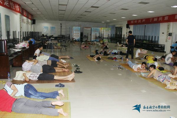 在大学生活动中心317教室里,已经有同学在地上铺了凉席,躺在上面纳凉,当然,身边也不乏专心学习的孩子。土木建筑学院的五位大一学生正在为3号的英语考试做准备,他们虽然也会去自习室蹭空调学习,但回到寝室后的落差让人身心烦躁。在得知学校的利民举措之后,7点就开始在317教室“待机”,晚上也准备拿着凉席就地而睡,“太好了,比寝室凉快不少”,他们说出的正是大家说想的。工程管理专业的柳杨盛激动地说:“刚才还在这看到余欢校长了,感觉学生的意见受到了重视,也得到了实际的反馈。余校长还告诉我们:‘今天就在这住,在班级群里也传播一下,让大家知道。’真的很暖心,谢谢余大大,谢谢我大昌航!”这句话中,有感激,有骄傲,有对学校浓浓的爱。