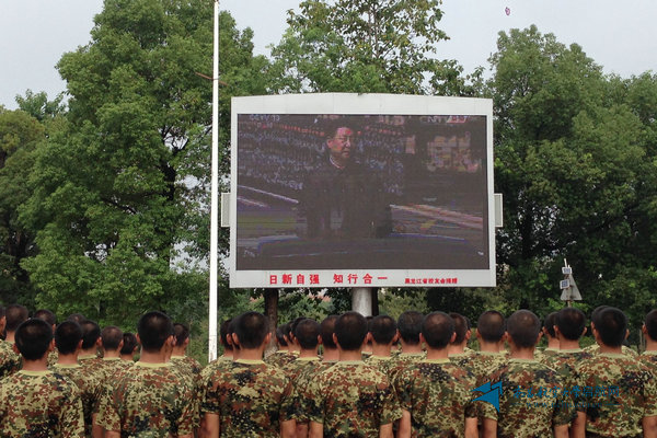 全体新生教官和部分在校师生观看校园LED大屏幕直播阅兵