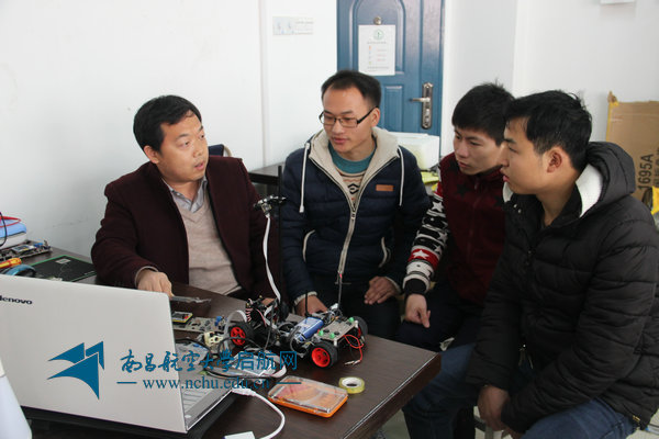 杜为(左一)指导学生备战课外科技创新竞赛(图/学工处)