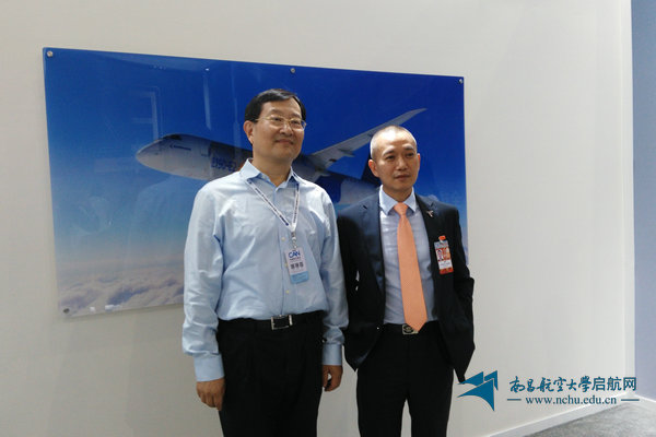 傅克刚与巴西航空工业公司大华区商用飞机市场及销售副总裁郭青合影(图/校友办)