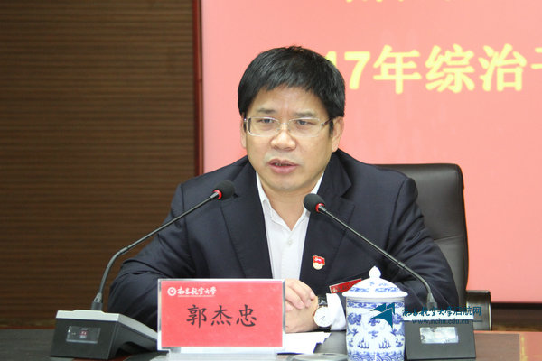 郭杰忠在开班动员讲话中指出,当前全校上下正掀起学习宣传贯彻党的十九大精神的热潮,在此期间举办综治干部培训班很有必要,认真学习十九大精神就要与本单位的本职工作紧密相结合,认真做好本职工作。他指出,综治工作是一项综合治理的系统工程,关系到广大师生员工生命财产安全,也是社会稳定的风向标。全校上下都要齐抓共管、共同参与,要不断增强责任感,勇于担当,尽职尽责,一岗双责,要持续抓好校园环境卫生整治、平安班级建设、安全隐患排查、安全宣传教育、应急值班和安全值守等工作,要为把我们的校园打造成为“平安、美丽、文明、幸福”校园而不懈努力。郭杰忠希望所有与会同志认真学习培训,了解掌握政策,树立“隐患就是事故”“问题不解决就是问题”的思想认识,强化底线思维,端正学习态度,加强组织纪律,理论联系实际,切实将理论业务知识吃透、消化,将所学知识运用到实践中去。