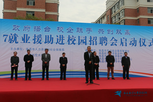 启航网讯 11月25日,由南昌市人力资源和社会保障局与南昌航空大学共同主办的主题为“政府搭台、校企联手、共创双赢”就业创业进校园活动在我校隆重举行。南昌市市委常委、常务副市长肖玉文、江西省人社厅副巡视员肖文、南昌航空大学副校长熊震宇、南昌市委组织部副部长、南昌市人力资源和社会保障局局长、党委书记黄小华等出席启动仪式,江西省人力资源和社会保障局就业处、南昌市人社局有关领导,南昌部分高校就业部门负责人、学校招生就业管理处和各学院相关负责人以及南昌各高校近5000名毕业生参加活动。