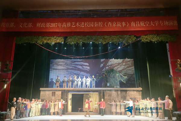 启航网讯 12月1日晚,由教育部、文化部、财政部主办的2017年高雅艺术进校园系列活动走进南昌航空大学,由陕西省戏曲研究院等单位联合演出的大型秦腔现代戏《西京故事》在我校大学生活动中心礼堂隆情上演。《西京故事》以亲切的语言、真实的场景、生动细腻的唱腔以及励志的故事情节赢得了全场千名师生一次又一次的热烈掌声,使观众零距离尽情感受了古老戏曲秦腔的独特艺术与文化魅力。