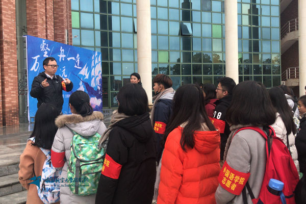 何兴道向志愿者们作动员讲话(图/外国语学院)