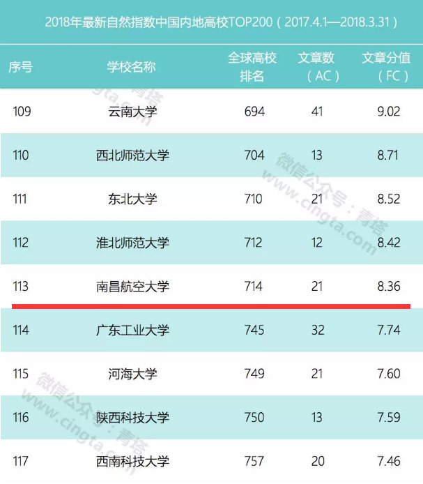 南昌航空大学在2018年最新自然指数排名中位列全国113位