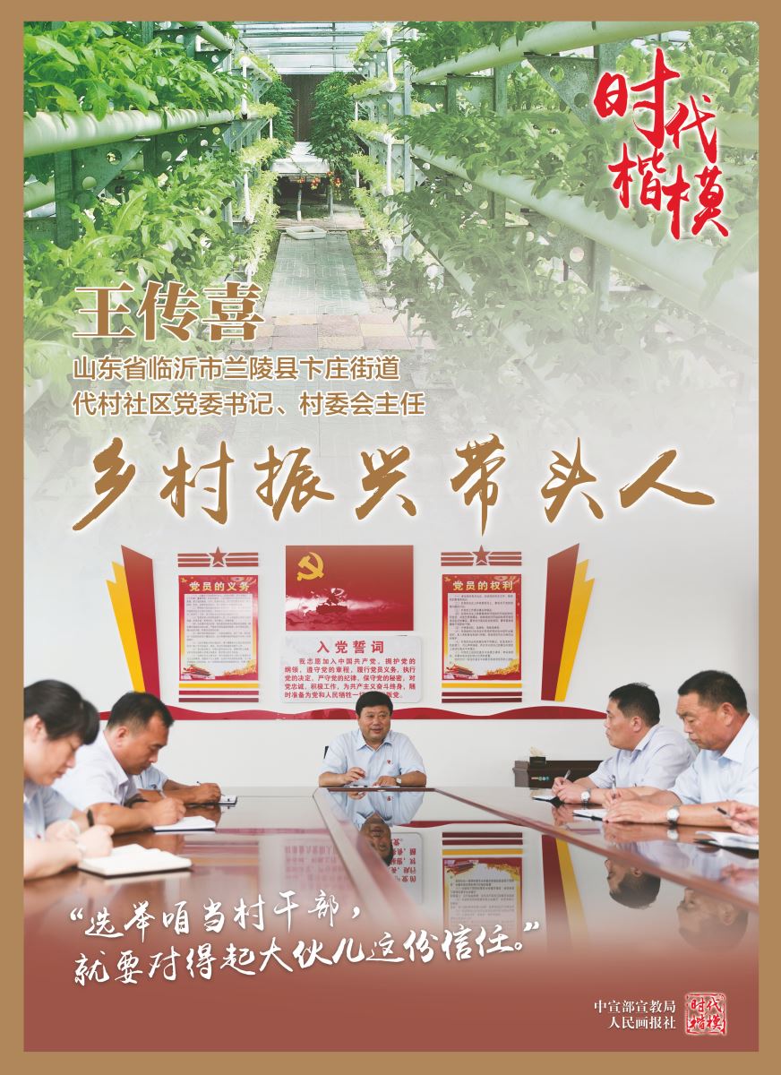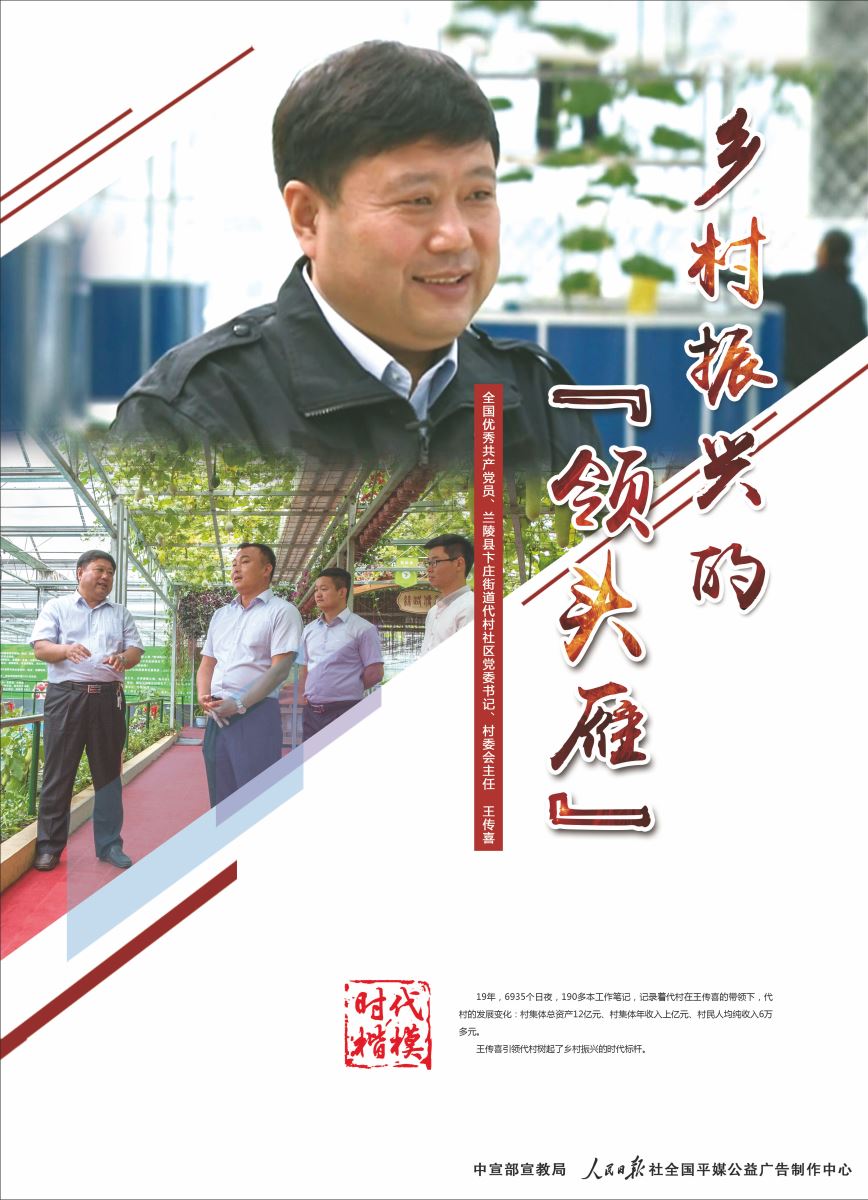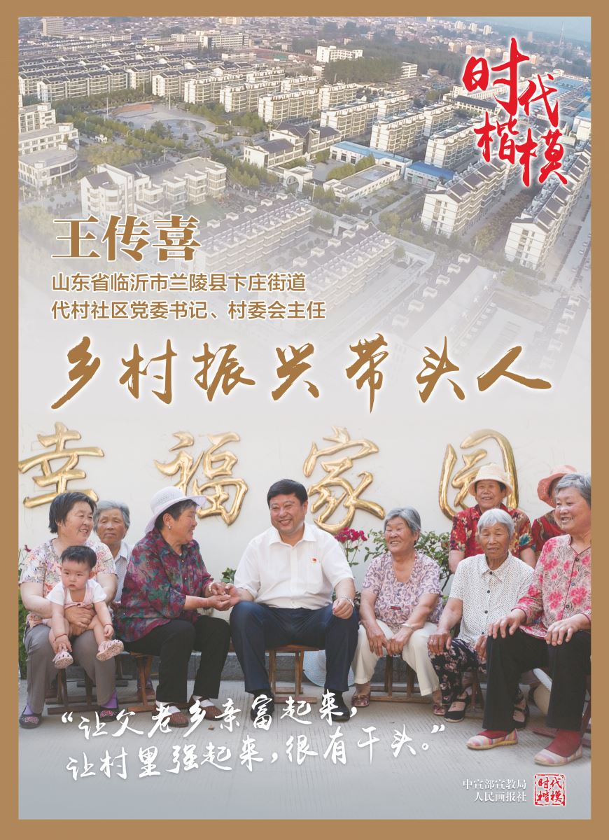 王传喜是山东省临沂市兰陵县卞庄街道代村社区党委书记、村委会主任,党的十九大代表。他担任基层党组织书记19年来,率领村“两委”班子和党员干部加强基层组织建设,发挥党员先锋模范作用,筑牢村庄发展根基;团结群众发展现代农业,壮大集体经济,实现村民共同富裕;积极推动乡村有效治理,倡导文明新风,不断提升群众获得感幸福感。王传喜始终牢记共产党员的初心使命,模范践行新时期沂蒙精神,干事创业、服务群众,赢得了干部群众的广泛赞誉,曾先后获得全国劳动模范、全国优秀共产党员等荣誉称号。